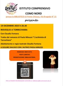 Infatti, il 19 dicembre, la Biblioteca aprirà le sue porte a due appuntamenti distinti: nel pomeriggio, a partire dalle 17:30 ci sarà lo spettacolo di Natale realizzato dagli alunni di Ponte Chiasso, un momento di festa e creatività scolastica, mentre la sera andrà in scena “Risveglio a Torrechiara”, ispirato al romanzo L’archivista di Torrechiara della scrittrice Paola Minussi.