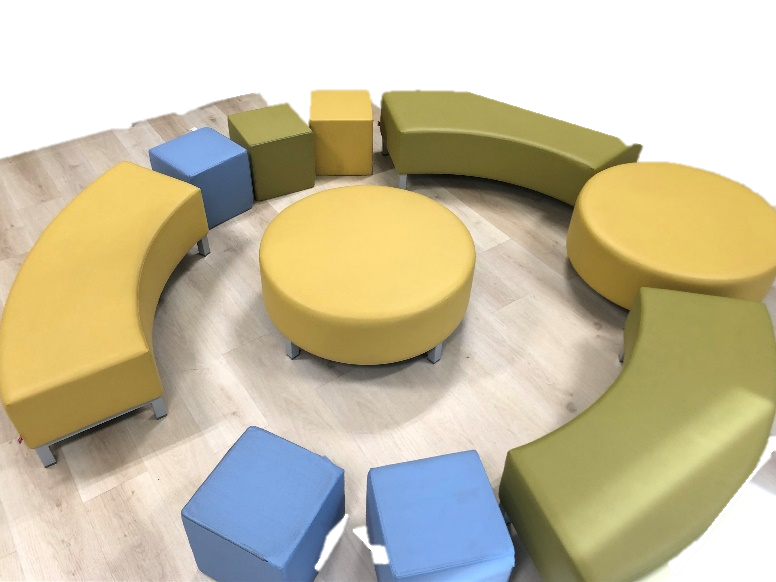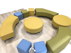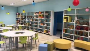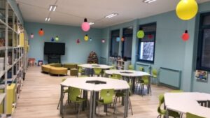 Nell’ampio locale sono presenti banchi modulari che consentono un’organizzazione flessibile, con isole di lavoro e postazioni riconfigurabili per attività individuale o di gruppo, sedie ergonomiche, scaffalature, pouf e sedute morbide che creano spazi comodi e piacevoli. È stato creato un ambiente accogliente, confortevole, funzionale, ordinato, esteticamente piacevole e accattivante.